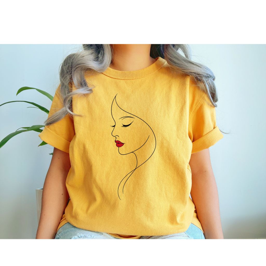 Minimal Line Art Woman Face T-shirt | Red Lips | Elegant Feminine Sketch